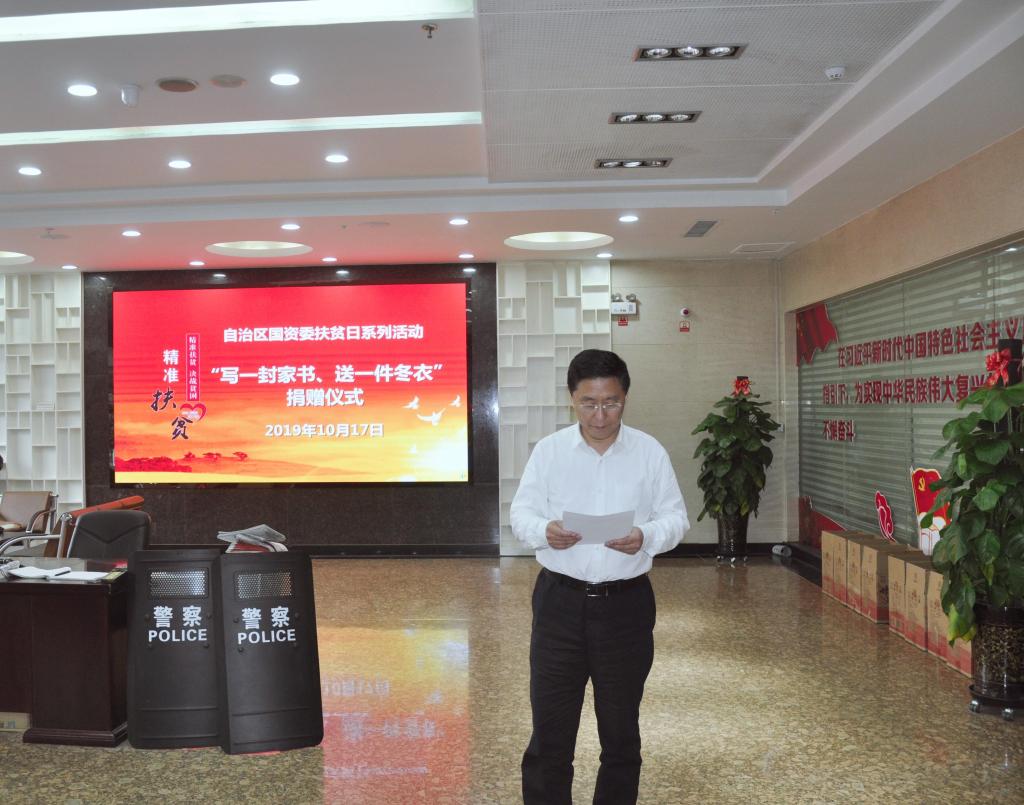 测试结束后,在机关一楼大厅开展了“写一封家书、送一件冬衣”捐赠仪式。国资委党委委员、副主任赵志江同志出席活动并致辞。赵志江同志指出,为了让各族贫困群众感受到以习近平同志为核心的党中央的关怀和厚爱,感受到祖国大家庭的温暖,同时增进机关干部与贫困家庭的感情,鼓励基层群众坚定脱贫的信心,全体机关干部要继续发扬优良传统,携手攻坚克难,以实际行坚定打赢脱贫攻坚战的信心和决心。